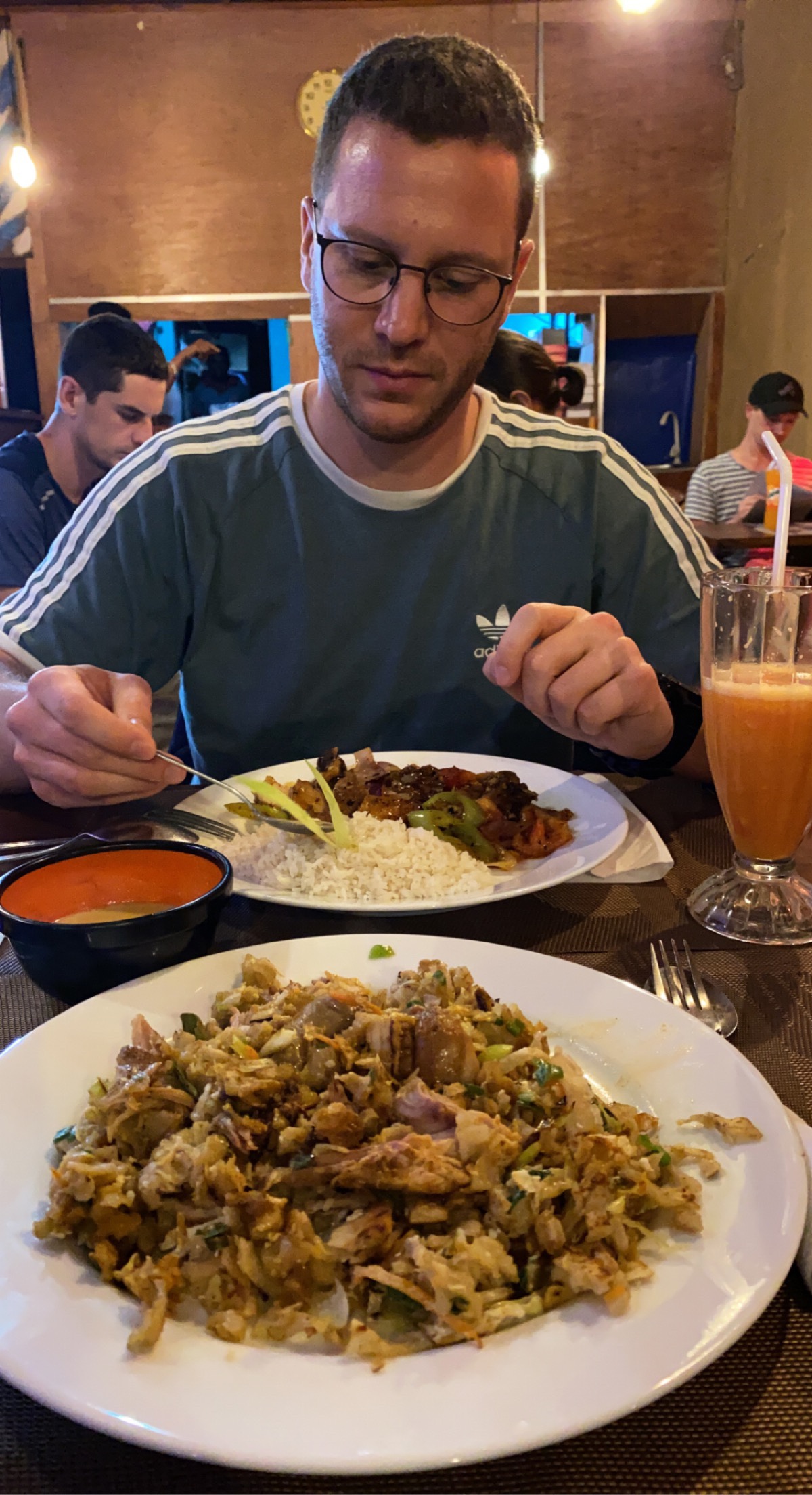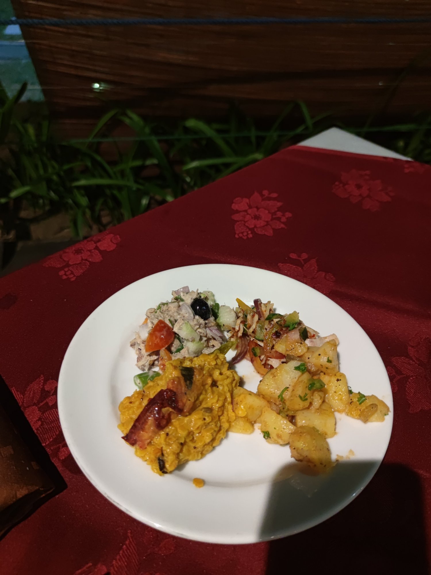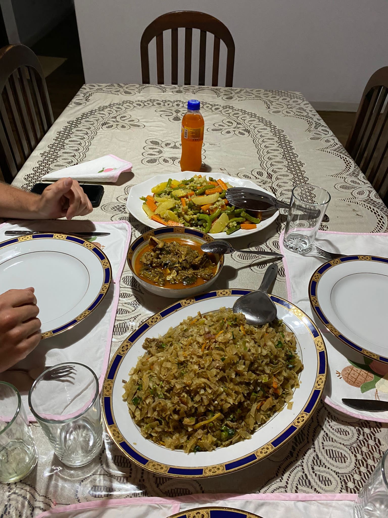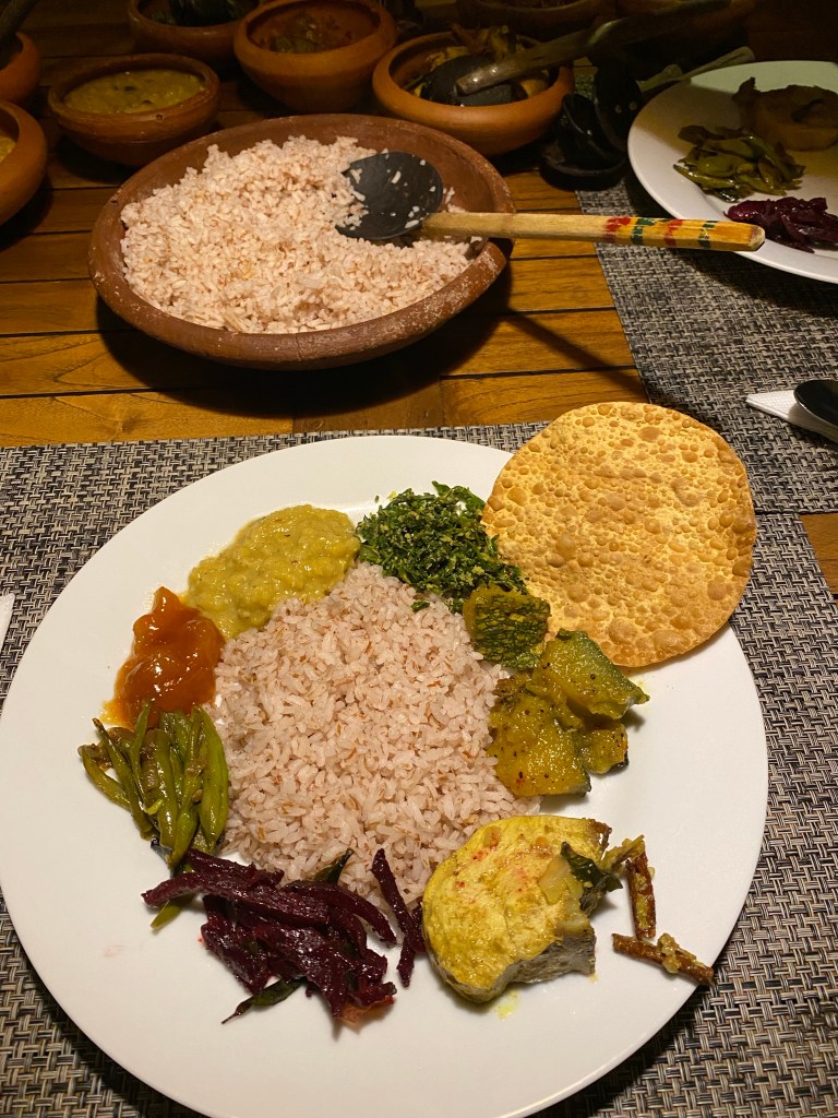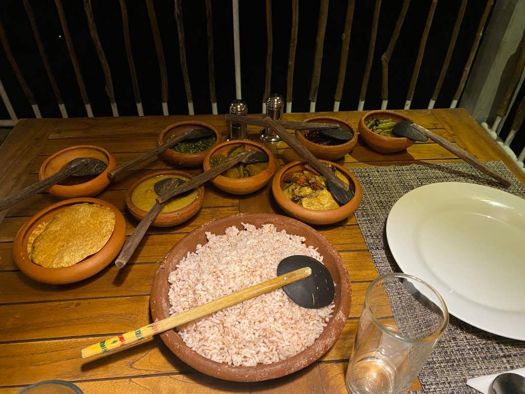 Zum Abendessen gab es eine klassische einheimische Mahlzeit mit Reis & verschiedenen Currys. Glücklicherweise saßen wir drinnen, da es ab Nachmittag bis tief in die Nacht ordentlich regnete.