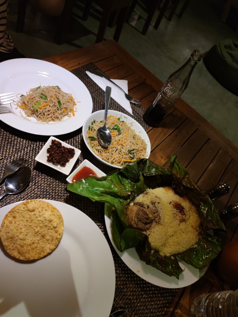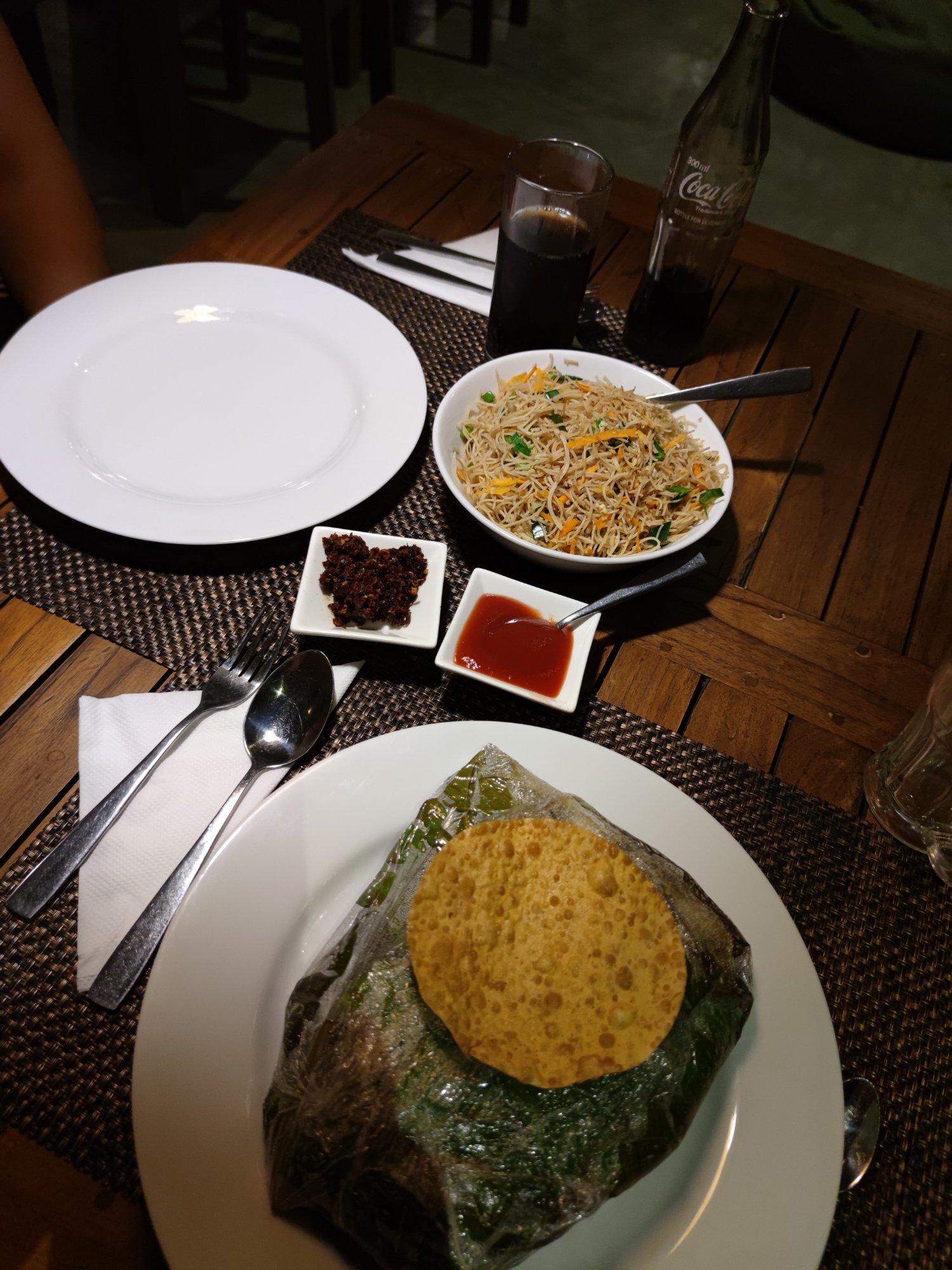 Abends waren wir dann doch sehr erschöpft und sind nur schnell etwas essen gegangen. Das Restaurant hat sich als Glücksgriff herausstellt, denn es gab sehr leckeres einheimisches Essen (Lump Rice) die Erklärung habe ich einfach mal bei Wikipedia kopiert: Es besteht aus zwei speziellen Currys (ein Drei-Fleisch-Curry, oft mit Rind, Schwein und Hähnchen – und Kochbananen mit Auberginen), Seeni Sambal, Belacan, Frikadeller-Fleischbällchen und in Brühe gekochtem Reis, die alle in Bananenblätter gewickelt und gebacken werden in einem Ofen.[6] Der Reis wird hergestellt, indem roher Rundkornreis mit Zwiebeln und Gewürzen in Butter oder Ghee gebraten und dann in einer Fleischbrühe gekocht wird. Ein hart gekochtes Ei, das frittiert wurde, ist ebenfalls eine übliche, aber nicht traditionelle Zugabe.