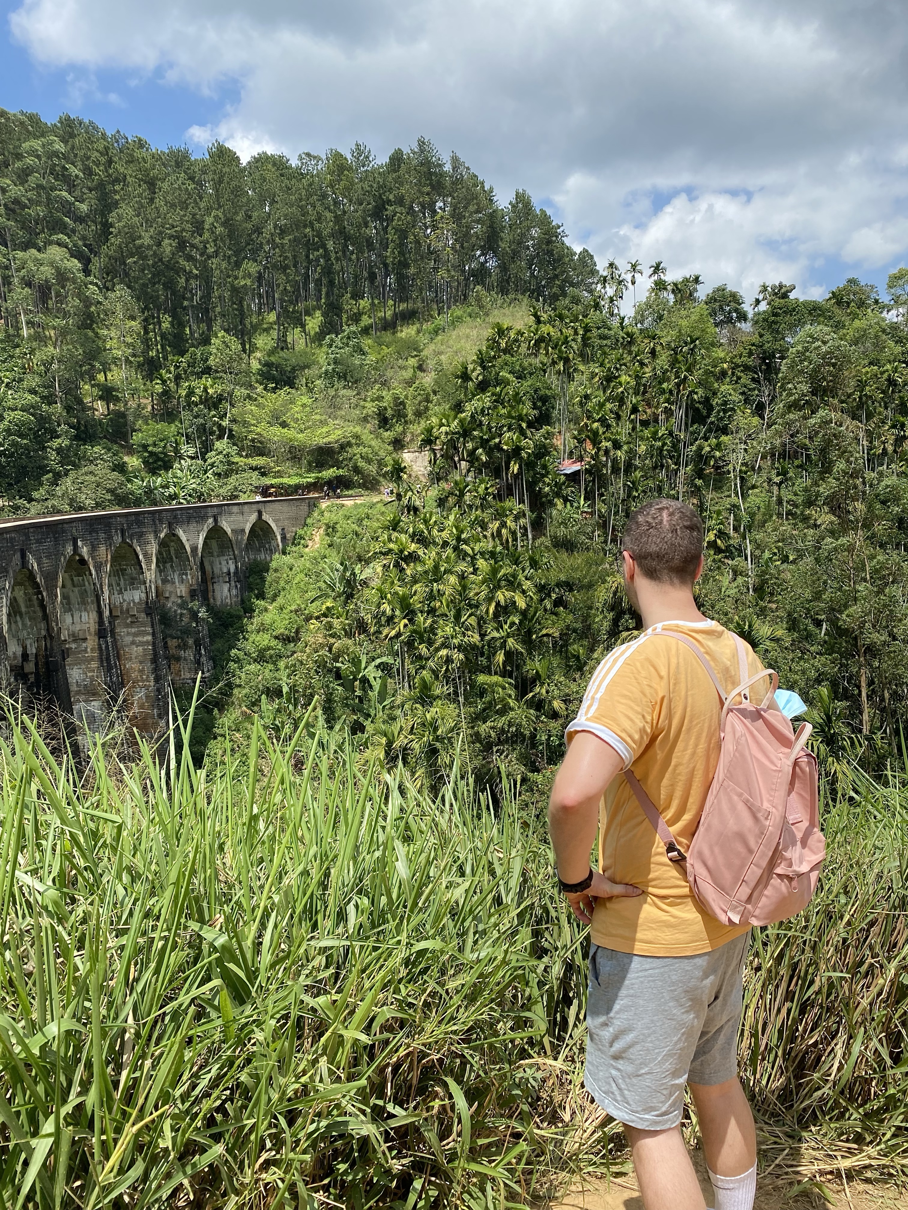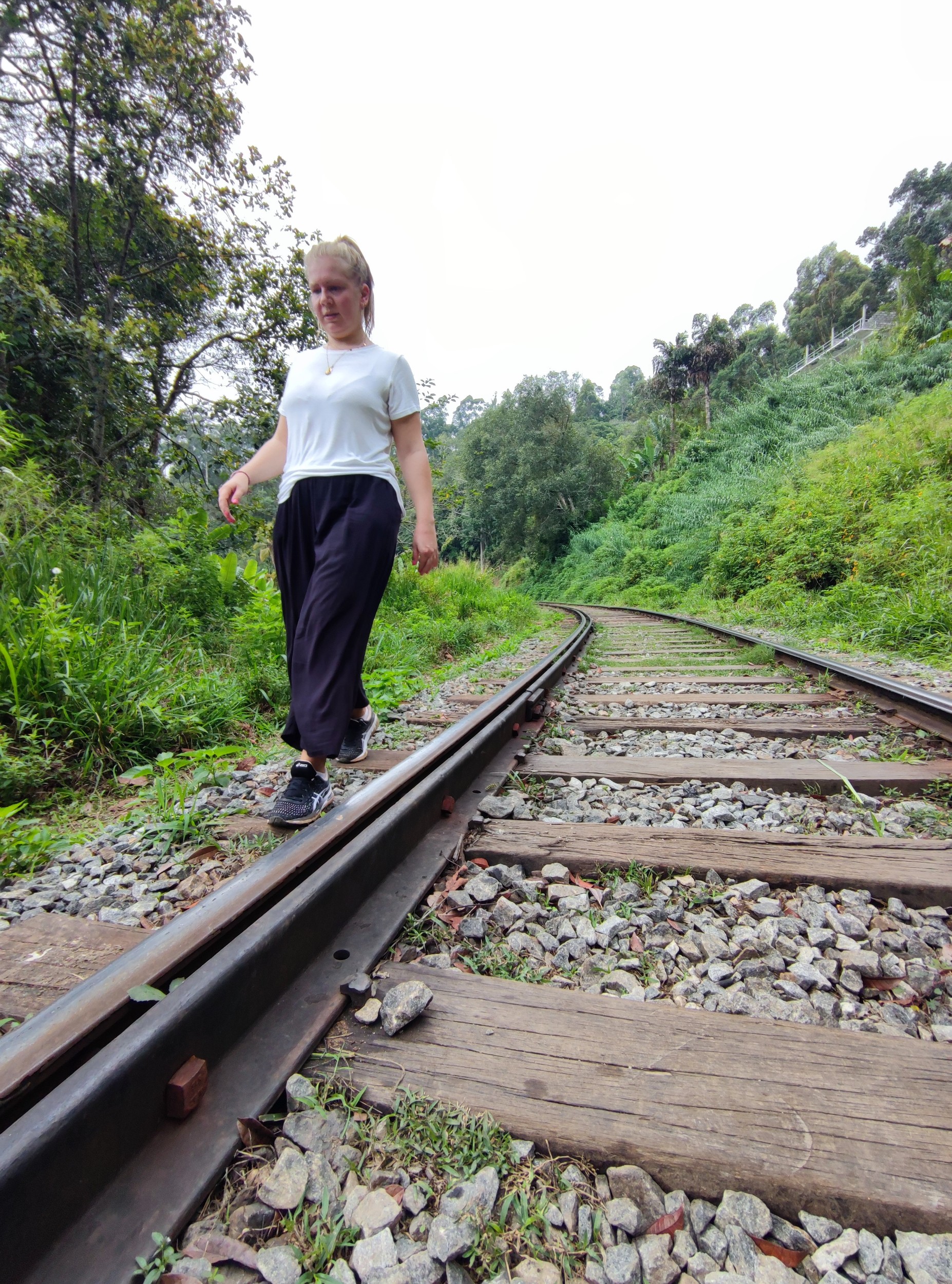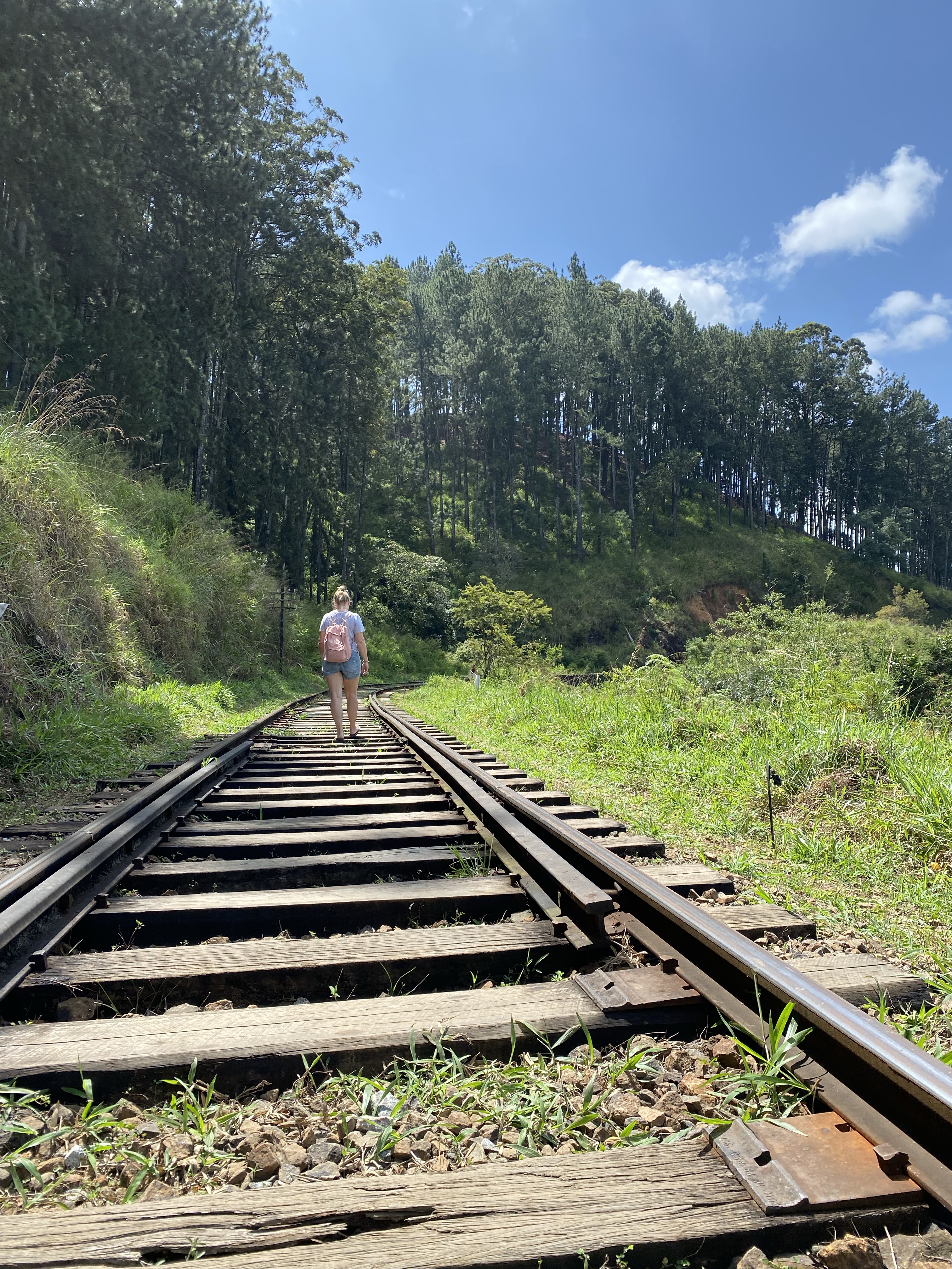 Nach dem Frühstück ging es für uns zufuß zur Nine Arches Bridge, einer Sehenswürdigkeit hier in Ella. Selbstverständlich gibt es keinen offiziellen Weg dorthin, sondern man läuft einfach vom Bahnhof aus die Bahngleise nach Norden entlang… Lea passte sich dem Schuhwerk der Einheimischen an und war in Flip-Flops unterwegs. Am Ende des Tages nach 8,5 km über Schotter und Bahnschwellen nicht die beste Idee 😂 Lea stand übrigens nicht ohne Grund so weit vorne vor dem Tunnel, denn wir haben die ankommende Bahn erst relativ spät gehört und waren bereits einige Meter in dem Tunnel… Ein Glück fahren die Bahnen nur Schrittgeschwindigkeit 😂