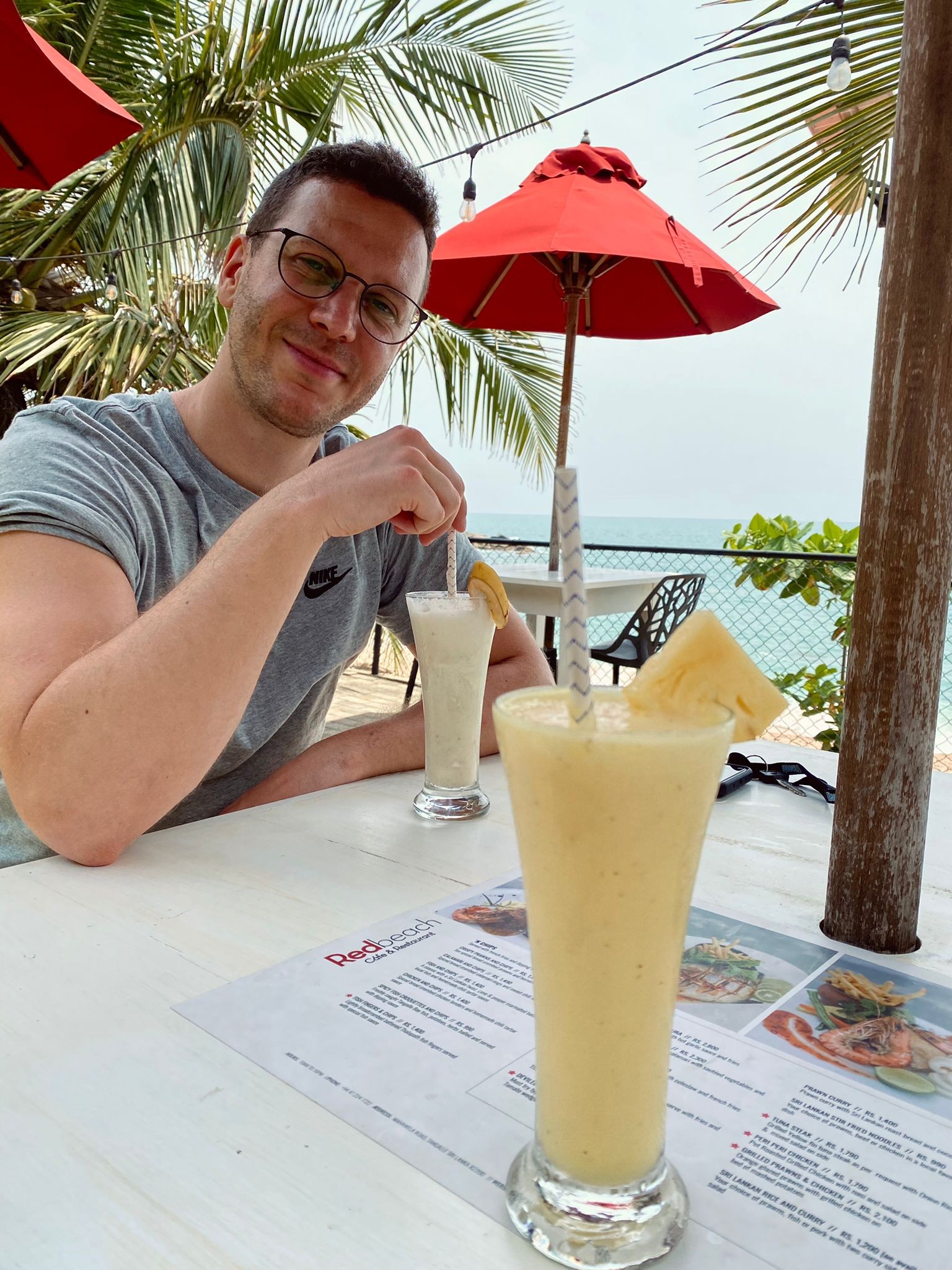 Jetzt sitzen wir mit einem ordentlichen Drink (Banana Super Shake) im Café.
