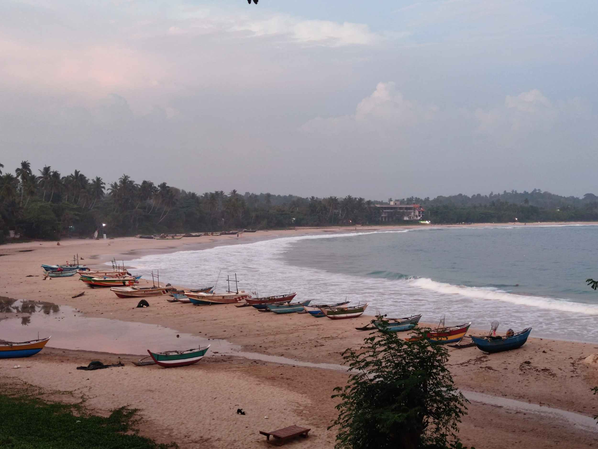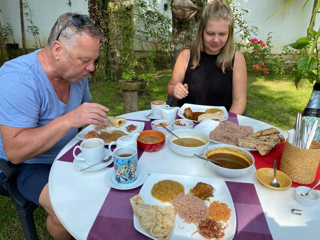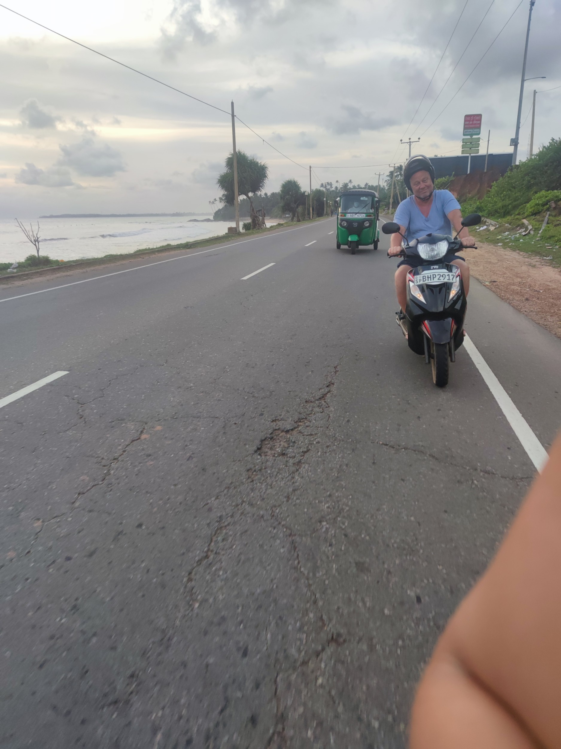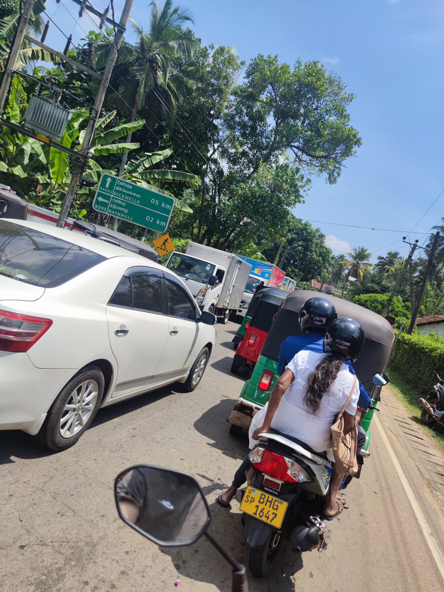 Unsere Reiseroute. Angekommen in Colombo, dann per Zug über Kandy nach Ella und von dort aus mit dem TukTuk nach Tangalle. Und aktuell in Talalla.Heute hatten wir ein klassisches Sri Lankan Frühstück mit verschiedenen Currys (Fisch und Hühnchen). Dazu Reisnudeln (String Hoppers) und Roti. Alles gut gewürzt und ordentlich Scharf!Ausblick beim AbendessenAbschied aus der Unterkunft in Tangalle am 04. FebruarEs herrscht ja eigentlich Linksverkehr, aber auf der linken Spur kam der Verkehr komplett zum erliegen, da alle zur Tankstelle abbiegen wollten. Also geht es im Gegenverkehr für uns weiter…