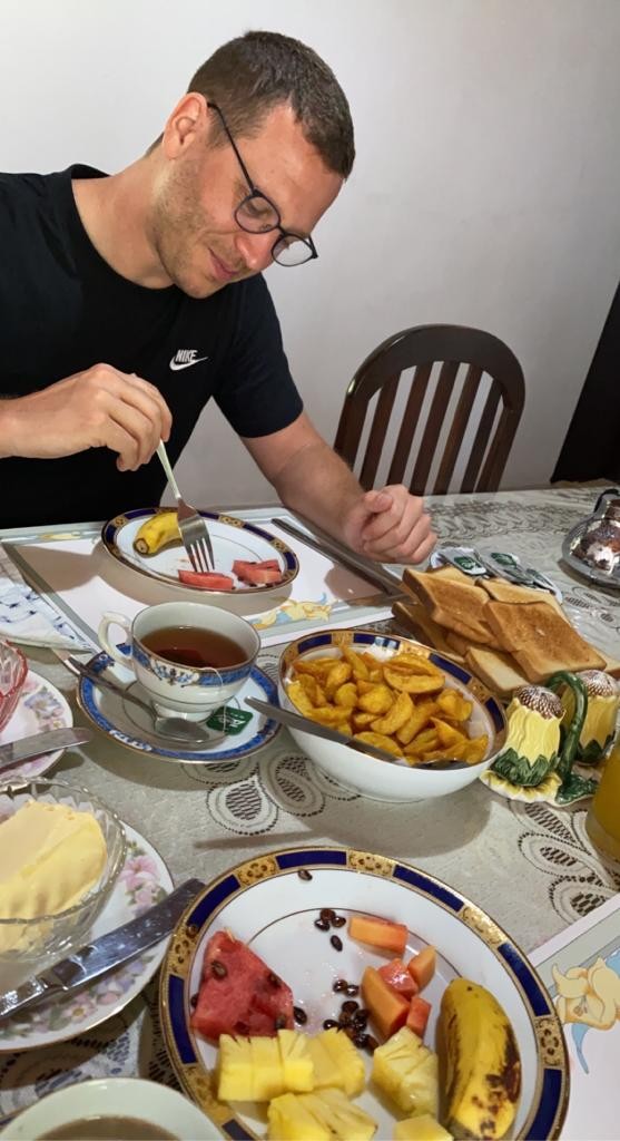 Heute hatten wir ein etwas ungewöhnliches Frühstück, denn es gab unter anderem Pommes / Wedges frisch aus der Fritteuse. Unser Gastgeber hat es außerdem sehr gut mit uns gemeint und mehrmals Pommes und Toast nachgelegt – jetzt können wir gut gestärkt und kraftvoll in den Tag starten! 😀