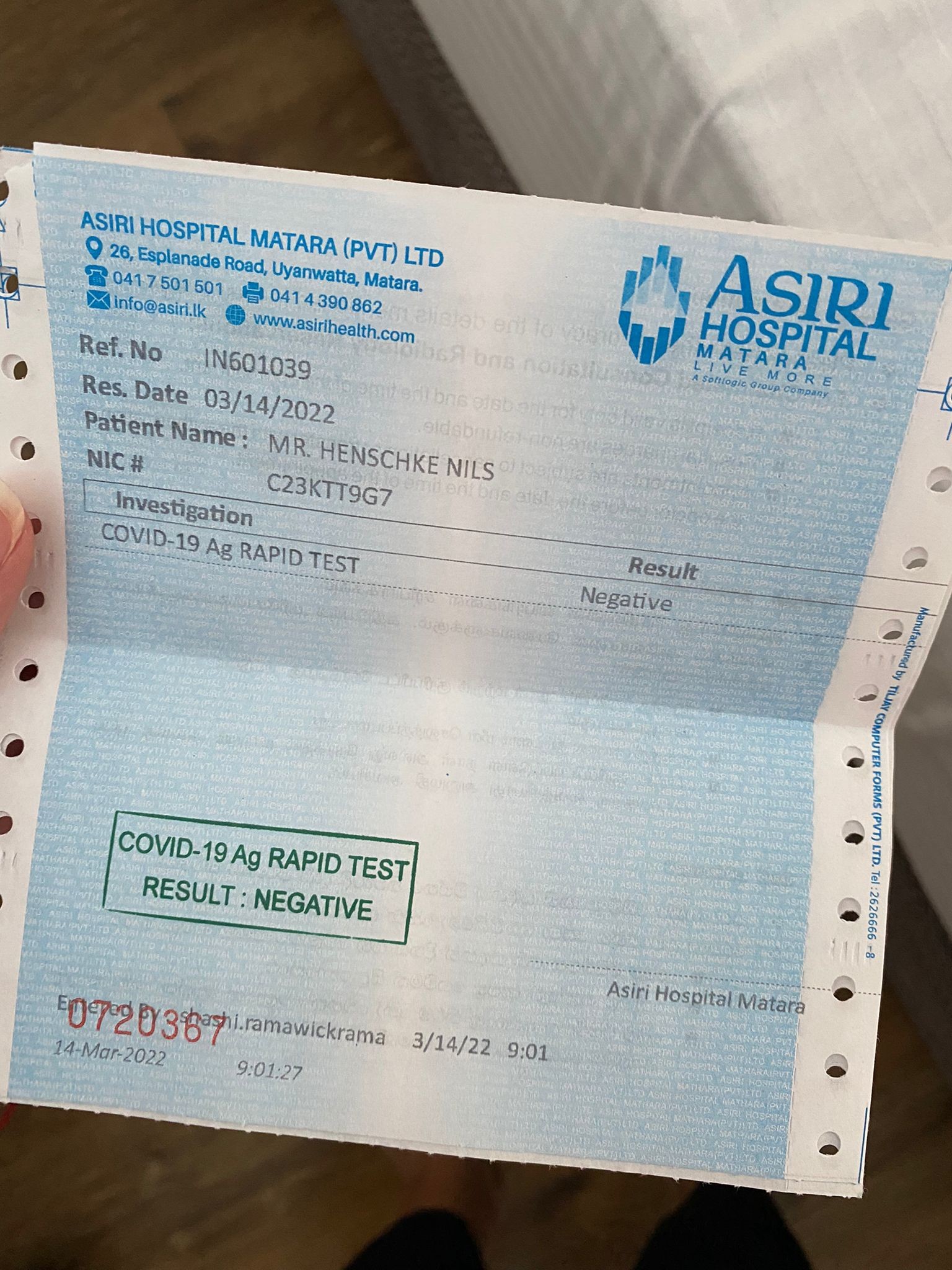 Morgen früh fahren wir ins Krankenhaus um uns für den Rückflug testen zu lassen. Danach geht es mit dem Taxi 3 Stunden zurück Richtung Colombo.